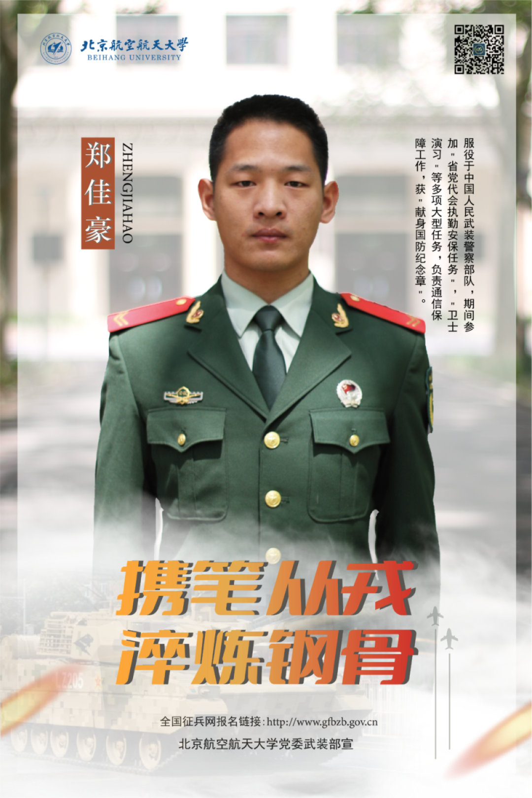 郑佳豪,2021年3月至2023年3月服役于中国人民武装警察部队,服役期间参加"省党代会执勤安保任务","卫士演习"等多项大型任务,负责通信保障工作,获"献身国防纪念章"。