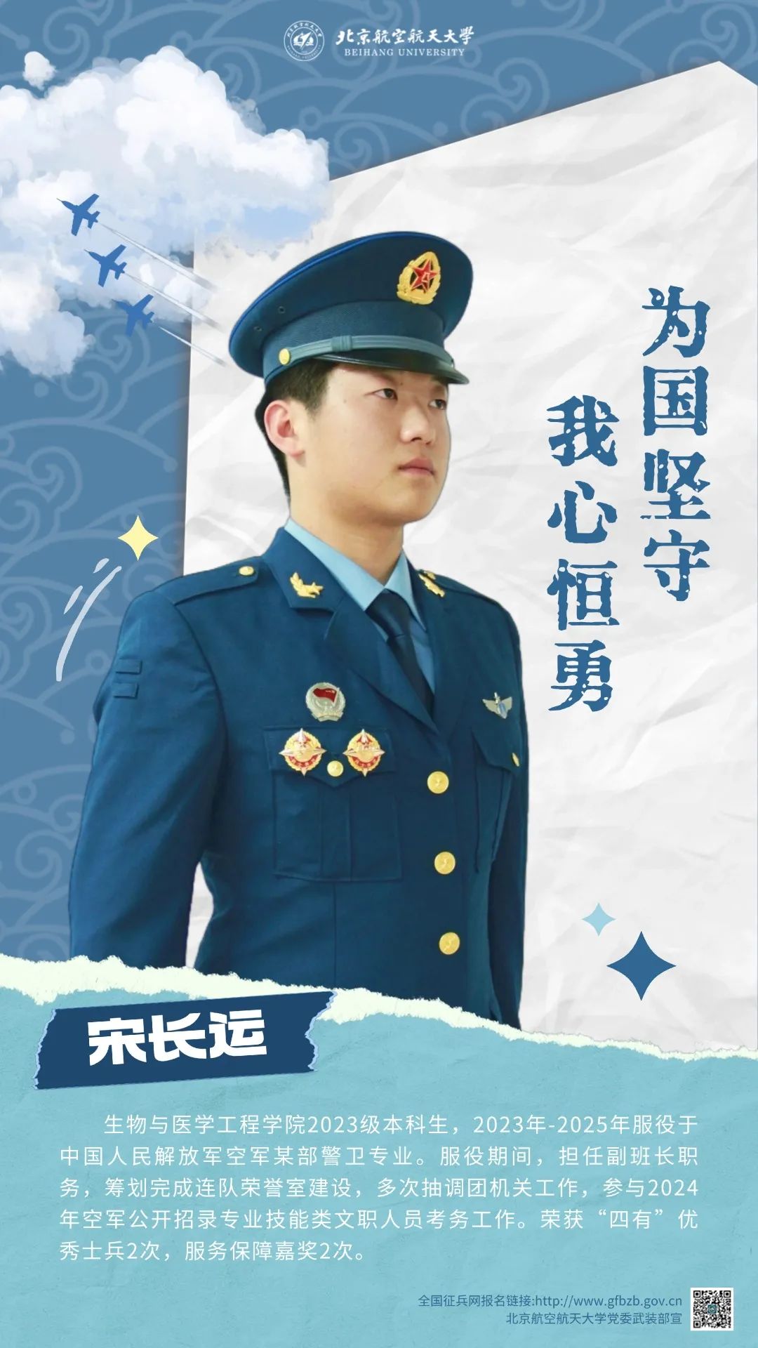 宋长运,生物与医学工程学院2023级本科生,2023年至2025年服役于中国人民解放军空军某部警卫专业。服役期间担任副班长职务,参加三次地方中学生军训任务,筹划完成连队荣誉室建设,多次抽调团机关工作,参与2024年空军公开招录专业技能类文职人员考务工作。荣获“四有”优秀士兵2次,服务保障嘉奖2次。