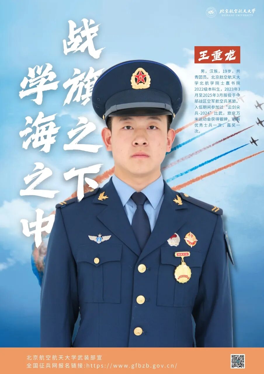 王重龙,男,汉族,19岁,共青团员。北京航空航天大学北航学院士嘉书院2022级本科生,2023年3月至2025年3月服役于中部战区空军航空兵某旅。入伍期间参加过“云剑尖兵-2024”比武,旅庆万米运动会获得银牌,四有优秀士兵一次,嘉奖一次。