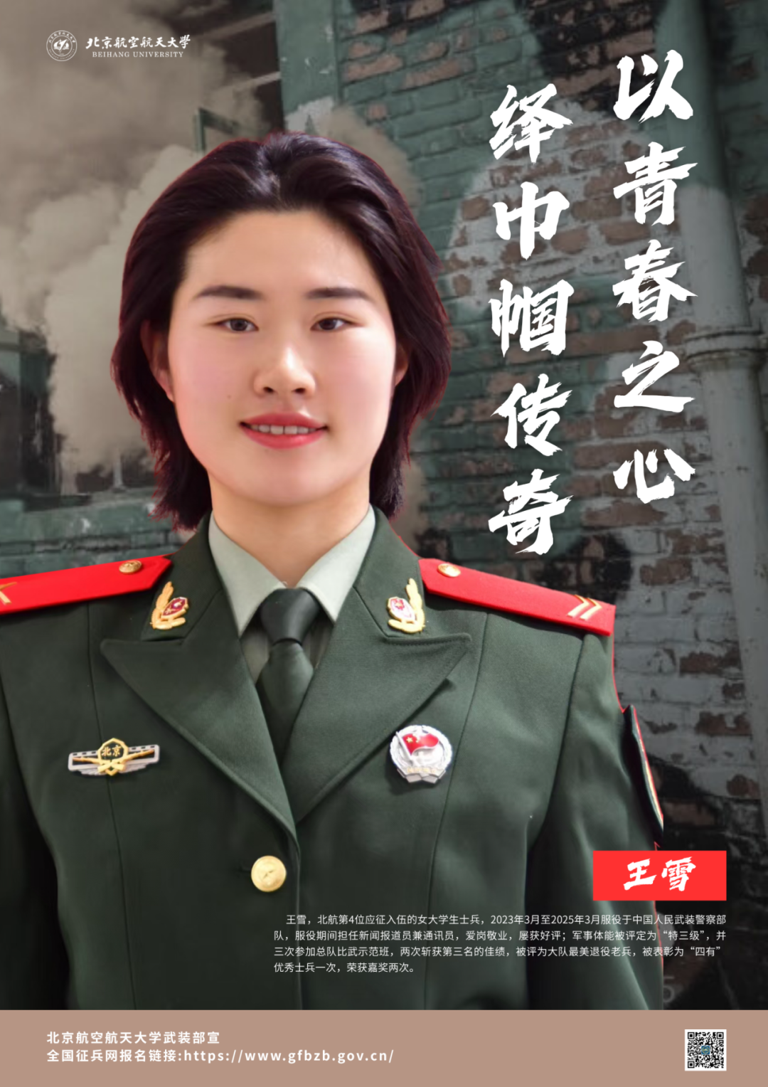 王雪,北京航空航天大学第4位应征入伍的女大学生士兵,中法工程师学院2021级本科生,2023年3月至2025年3月服役于中国人民武装警察部队,服役期间担任新闻报道员兼通讯员,爱岗敬业,屡获好评;军事体能被评定为“特三级”,并三次参加总队比武示范班,两次斩获第三名的佳绩,被评为大队最美退役老兵,被表彰为“四有”优秀士兵一次,荣获嘉奖两次。