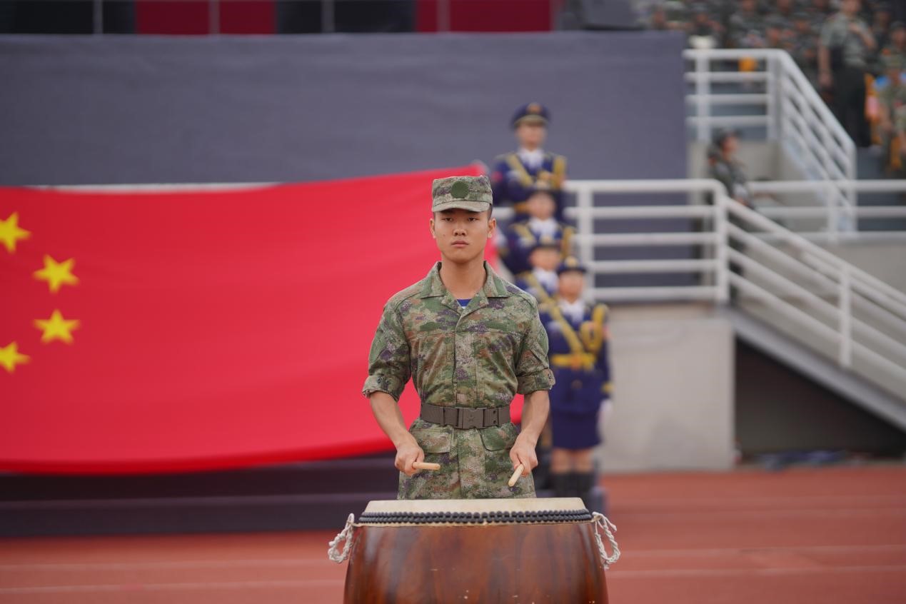 闭营仪式开始前,学生携十面战鼓入场,共同敲响80下,代表着北航军训团全体将士向中国人民抗日战争暨世界反法西斯战争胜利80周年献上的崇高敬礼。主席台正前方,庄严地展示着2023年10月25日在天安门广场升起的国旗,这面具有特殊象征意义的国旗由天安门地区管委会赠予我校,共同见证北航学子这十四天以来的成长与蜕变。