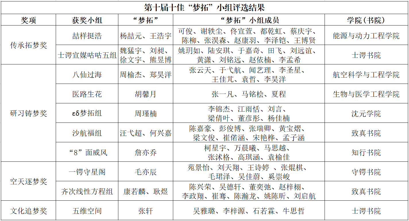 经现场评选,“士谔宣媒咕咕五组”“沙航福组”等10个“梦拓”小组获得第十届十佳“梦拓”小组称号。学生工作部部长宋晓东和学生中心主任纪一鹏为获奖队伍颁奖。