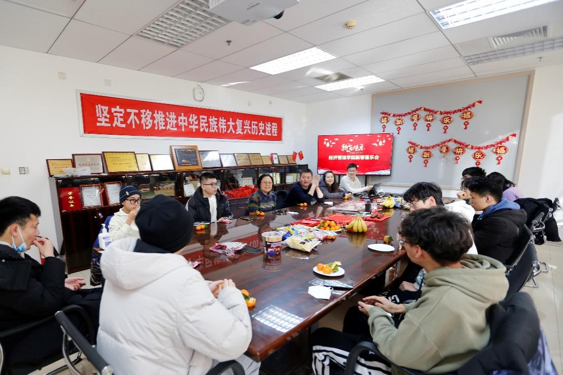 新主楼A710室温馨热闹,喜气洋洋,老师和同学们围坐在一起开怀畅聊,一片欢乐祥和的节日气氛。同学们依次分享了留校期间的学习生活计划,经济管理学院院长范英详细了解了同学们留校期间的学习生活,并就合理安排寒假生活,保持好学习和生活节奏给出了建议。经济管理学院党委副书记高超嘱咐同学们在校期间要注意安全,多给父母长辈打电话、报平安、送祝福,度过一个安全、健康、美好、充实的寒假。