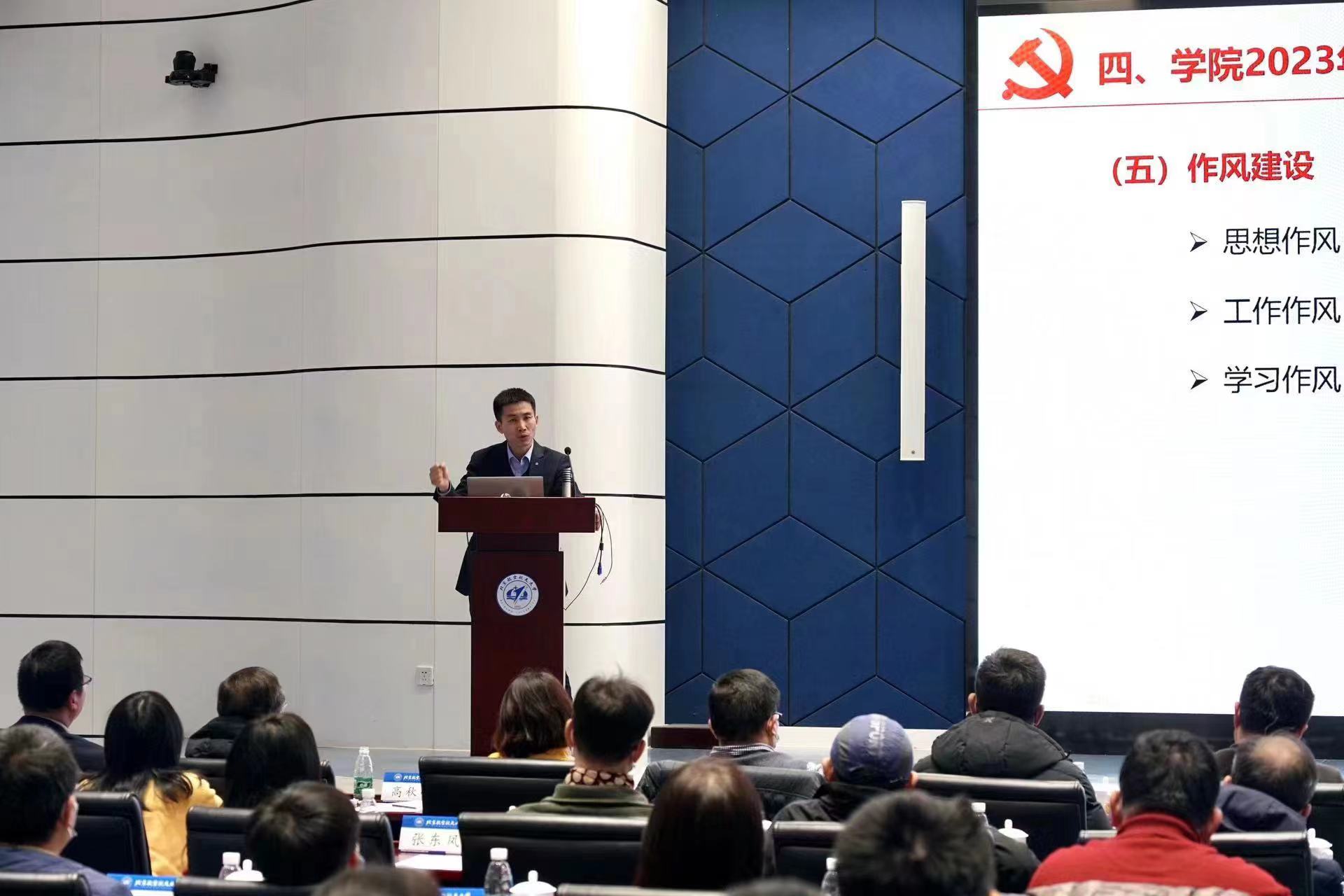 化学学院院长刘明杰传达了学校2023年度工作会暨第九届教职工代表大会第四次会议精神,对学院2022年工作成绩进行总结,并依据学校工作总体要求及重点工作,对学院2023年重点工作进行部署。