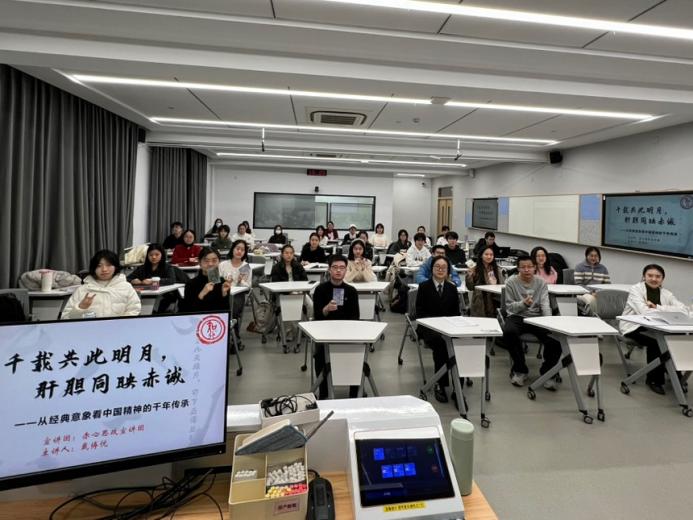12月23日,知行书院“赤心思政宣讲团”开展“千载共此明月,肝胆同映赤诚”主题宣讲活动。宣讲团成员戴博悦聚焦“月”这一中华文化意象,以诗词为媒、时代为景,通过意象鉴赏和互动导学相结合的方式,引导学生在文化溯源中筑牢信仰根基、涵育家国情怀。