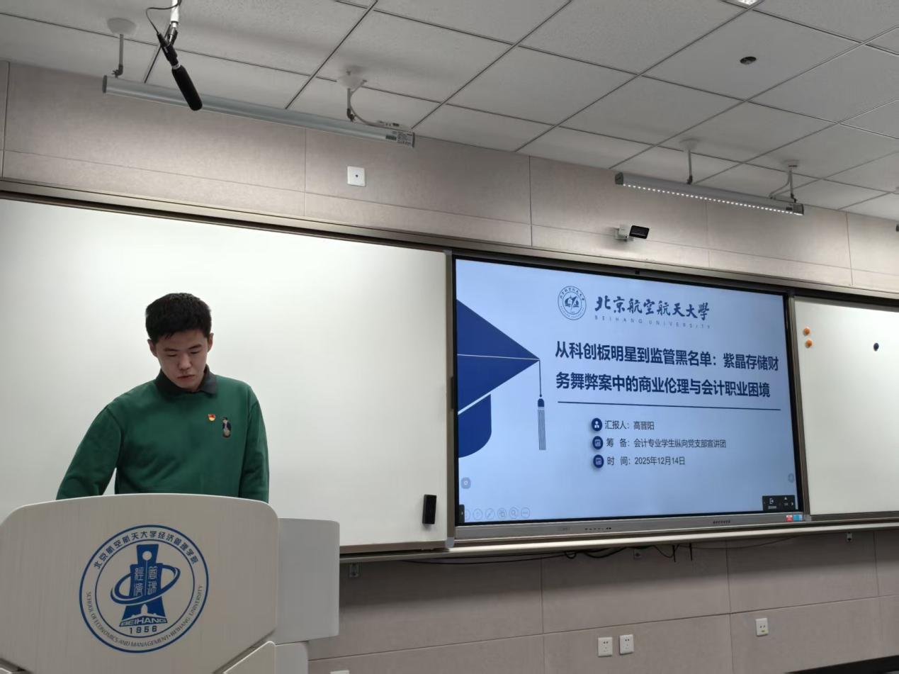 为持续深化学生党员职业道德教育,凝聚支部共建合力,12月14日,经济管理学院BY2508党支部与会计专业学生纵向党支部在新主楼A949联合举办诚信教育专题活动。会计专业学生纵向党支部微案例宣讲团成员高晋阳同志受邀作“紫晶存储财务舞弊案”主题宣讲。此次活动是两支部继共同参观声智科技、开展科技伦理研讨之后,围绕“诚信执业与党员责任”主题开展的又一次深入共建,进一步推动了跨支部交流与专业教育融合。