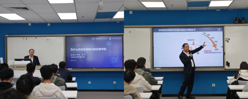 专业宣讲环节,经济管理学院院长吴俊杰围绕人工智能时代下的决策智能研究、学院典型成果、核心专业特色,以及一流科技商学院的发展前景等内容展开讲解,帮助同学们系统了解经管学院的学科建设与培养理念,建立起对各专业的全面认知。